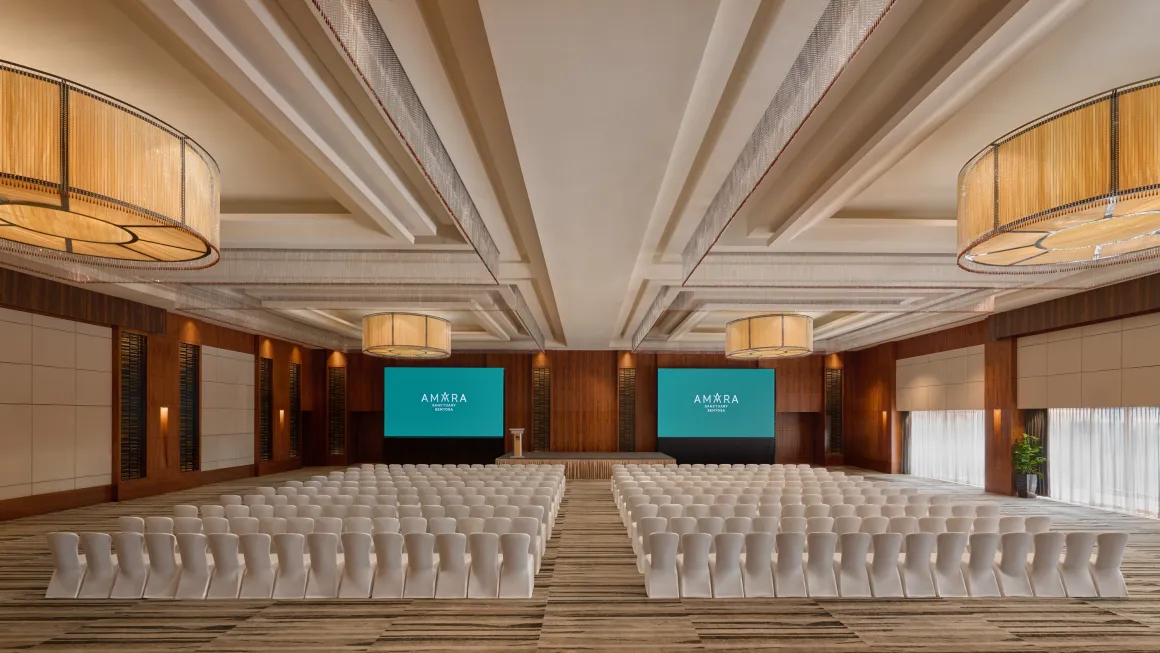 グランドボールルームは、柱のない開放的な空間で、まさに壮麗な雰囲気を醸し出しています。着席で最大450名、立食形式では1,000名以上を収容できるため、大規模な会議に最適です。また、ご要望に応じて2つの小規模なボールルームに分割することも可能です。さらに、11.5m×3.4mのLEDスクリーンもご利用いただけます。